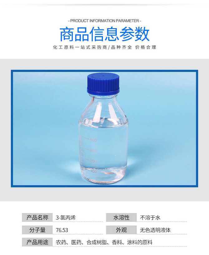 2.兼有烯烴和鹵代烴的反應性,是甘油、環氧氯丙烷、丙烯醇等的有機合成中間體。也用于農藥、醫藥的原料。還可用作合成樹脂、涂料、粘結劑、增塑劑、穩定劑、表面活性劑、潤滑劑、土壤改良劑、香料等精細化學品的原料,主要用于制造環氧氯丙烷、甘油、氯丙醇、丙烯醇、農藥殺蟲雙、醫藥、樹脂、涂料、粘合劑,以及丙烯磺酸鈉,潤滑劑等。